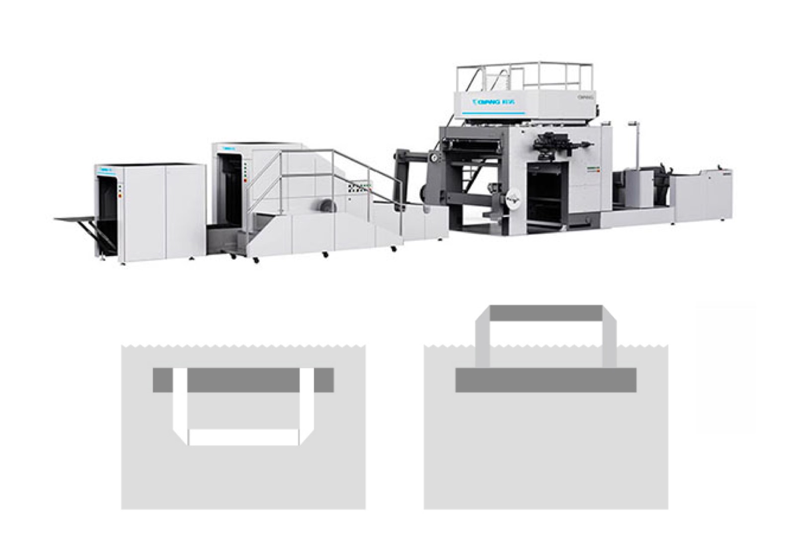 Esta máquina foi projetada para fabricar sacos de papel de fundo quadrado com alças de corda plana a partir de rolo de papel, rolo de remendo de papel e rolo de papel de alça plana, e é um equipamento ideal para a produção rápida de bolsas de papel. Ao completar as etapas de produção do guiador, adesão do guiador, formação do tubo de papel, corte do papel e formação do fundo do saco de uma só vez, esta máquina realmente realiza uma produção totalmente automatizada e pode efetivamente economizar custos de mão de obra. O processo exclusivo de fabricação de cabo de corda plana e a função especial de contagem de produtos acabados melhoram efetivamente a eficiência da embalagem em lote de produtos acabados dos usuários.